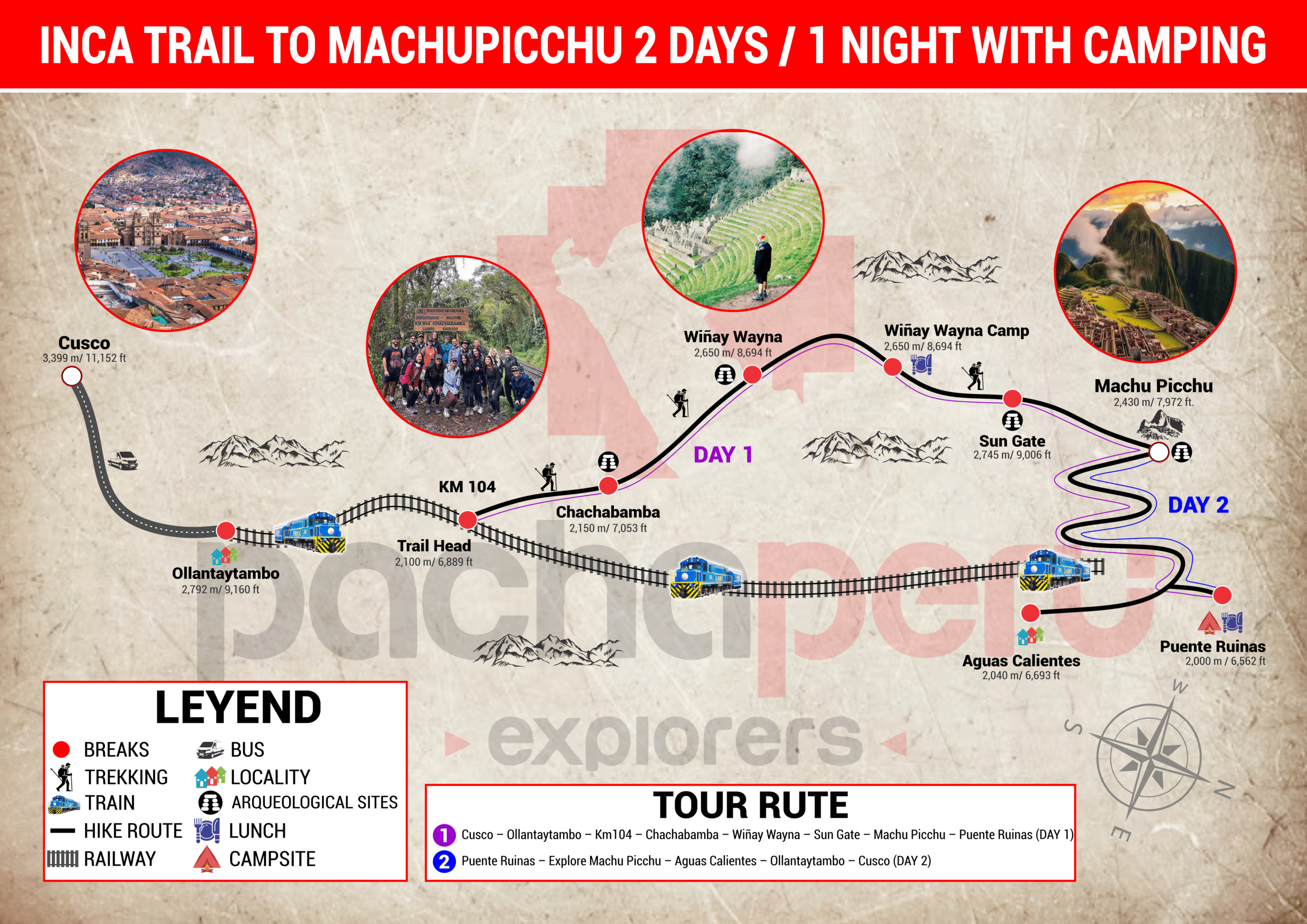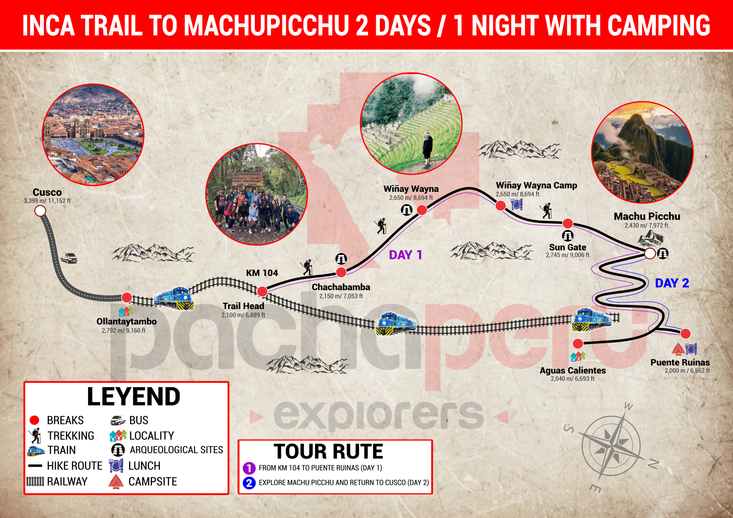 The short Inca Trail is an excellent option for those who want to hike the trail but are short on time. The trail is only 2 days long and is a great way to see some of the most incredible views of the Andes Mountains. The trail starts at Km 104, about 1 hour from Cusco by train from Ollantaytambo. From there, you will hike for about 4-5 hours to reach the site of Wiñay Wayna. You will enjoy a box lunch and continue the final stretch of the trail to Machu Picchu to the Sun Gate (Initupunku), from where you will have the first and most amazing view of Machu Picchu.