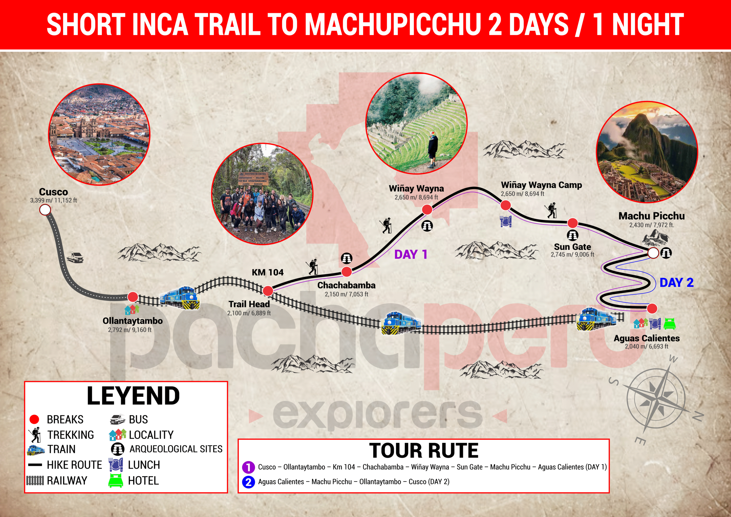 The short Inca Trail is an excellent option for those who want to hike the trail but are short on time. The trail is only 2 days long and is a great way to see some of the most incredible views of the Andes Mountains. The trail starts at Km 104, about 1 hour from Cusco by train from Ollantaytambo. From there, you will hike for about 4-5 hours to reach the site of Wiñay Wayna. You will enjoy a box lunch and continue the final stretch of the trail to Machu Picchu to the Sun Gate (Initupunku), from where you will have the first and most amazing view of Machu Picchu.
