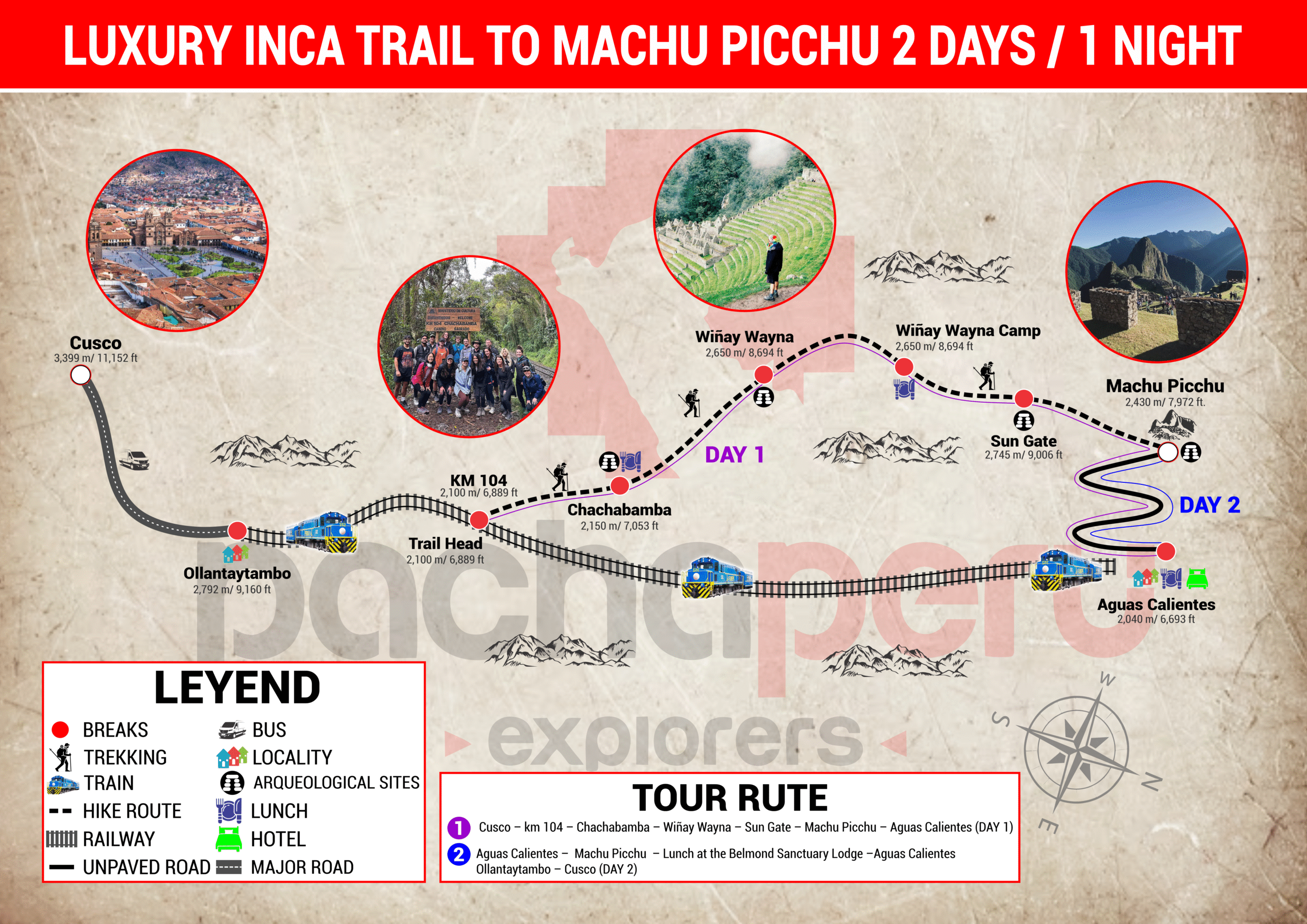 We will pick you up from your hotel in Cusco at 4:00 am and drive for 2 hours to Ollantaytambo train station. If you stay in Ollantaytambo or the Sacred Valley, the pick-up will be almost 2 hours later. We will board the first trains in Ollantaytambo to the Inca Trail – Chachabamba (Km 104). Upon arrival, you will pass the checkpoint, where you must show the original passport.