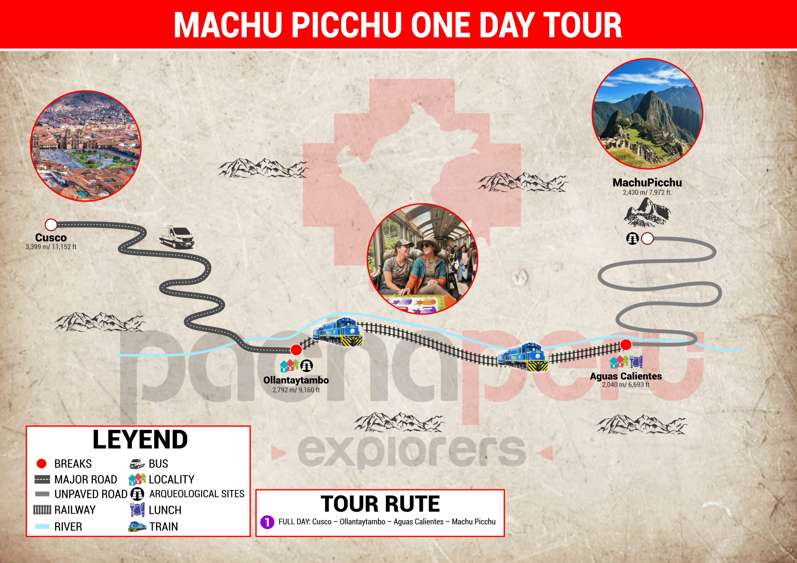 In Aguas Calientes, you’ll board the train to Ollantaytambo and then travel to Cusco in our private transport. We’ll drop you off at the door of your accommodation. Your arrival time will depend on your scheduled train ticket.